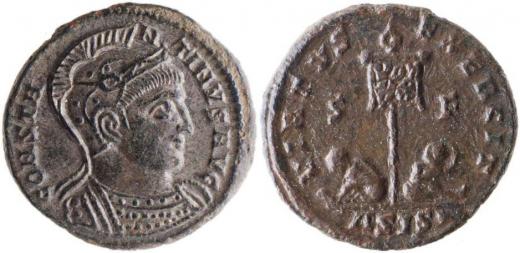 AE follis, cca 320, minc. Siscia, rv: dva zajatci po standardou, RIC VII, 109 D
