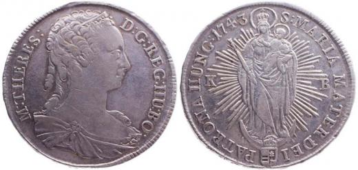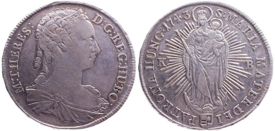tolar 1743 KB, Husz.1668, opis: M:THERES:, dvě lokny, nep.škr., R