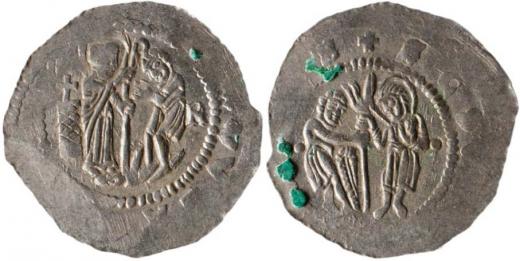 denár Cach 587 var. Av: vpravo velké písmeno "R" rv: dvě kuličky po stranách, 0,775g, mírně nedor., stopy kor. R