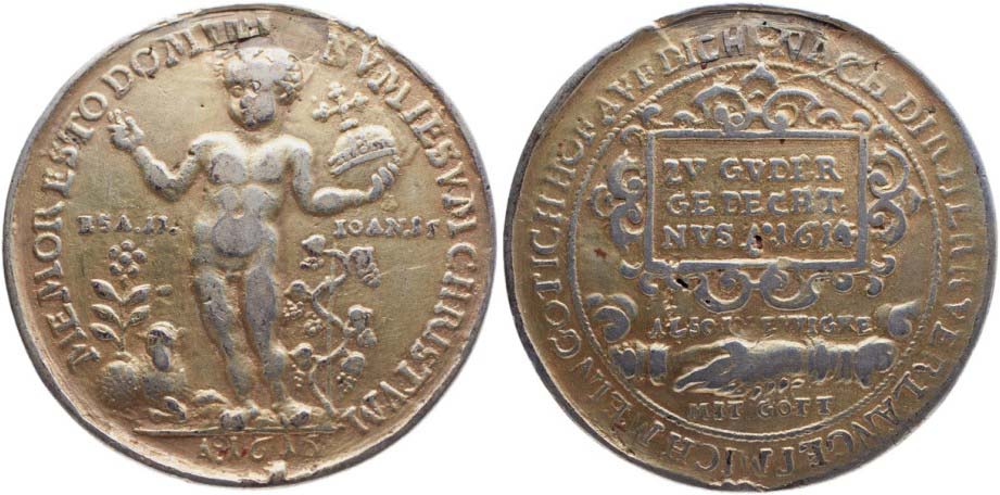 Ag medaile 1615 litá zlacená, hoch držící jablko, opis MEMO ESTO DOMINNVM IESVM CHRISTVM/3 řádkový nápis, spojené ruce 33mm/8,4g