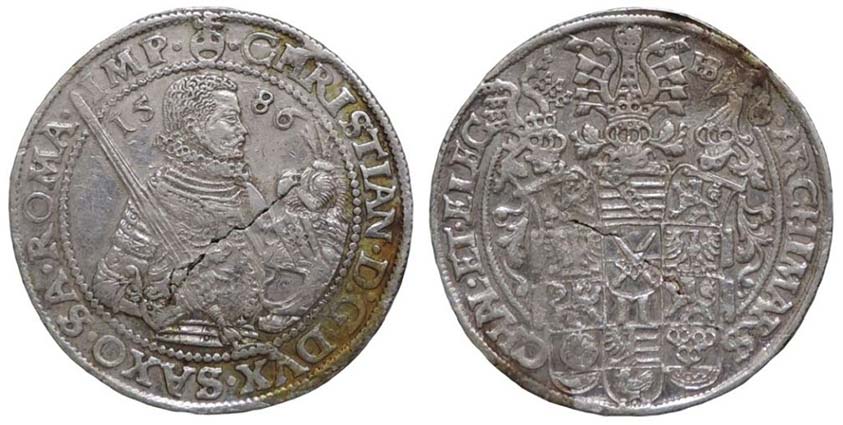 tolar 1586 HB, naprasklý ražbou, stopy kor., 29,089g