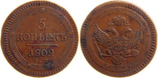5 kopějka 1802 EM, Jekatěrinburg, Bitkin 2. 283, nep.škr.