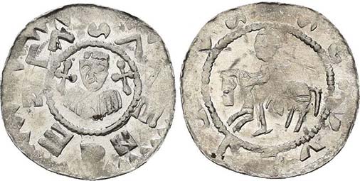 denár Cach-, Šm-, VP 209, poprsí s kříži po stranách/jezdec doleva, 0,59g R