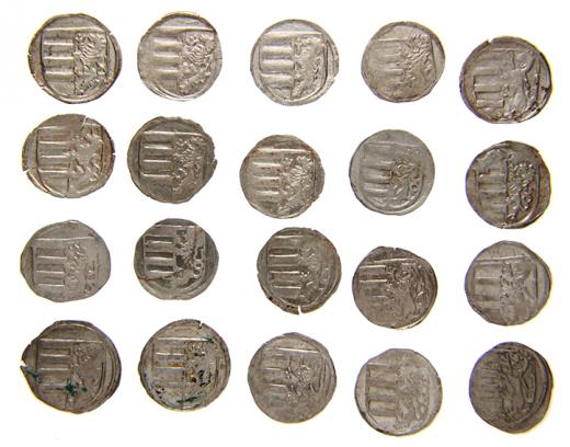 peníz s uhersko-českým znakem, sbírka 20 exemplářů z různých razidel - obsahuje i varianty, nezahrnuté ve studii J.Militkého: Mincovna Matyáše Korvína v Českých Budějovicích a otázka identifikace její produkce, in: Sborník k 75. výročí narození Pavla Radoměrského, Praha 2002; většina ve sbírkových stavech, část ned.