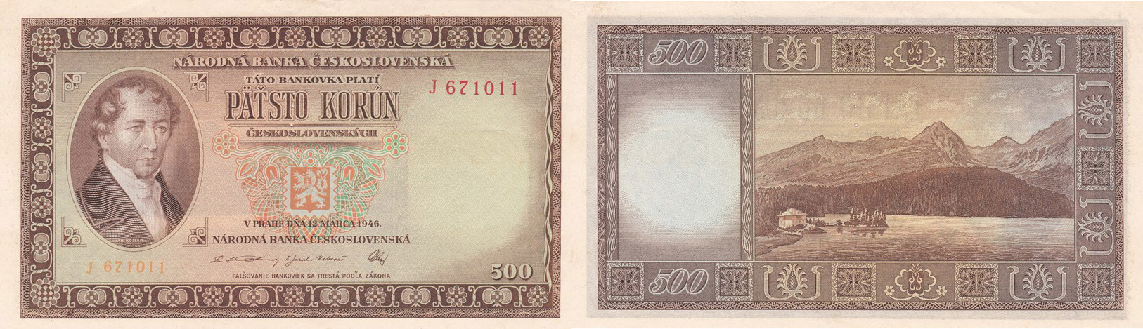 500 Kč (1946) perf. 3 dírky, J 671011, Bajer 80