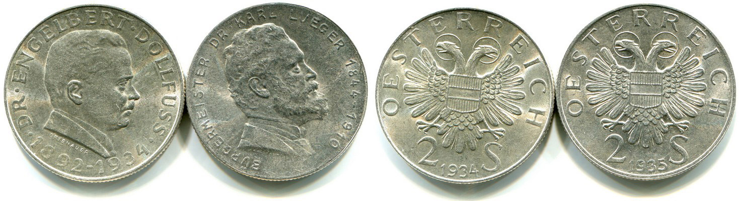 2 šilink 1934 -Dollfuss, 2 šilink 1935 - Lueger, 2 ks