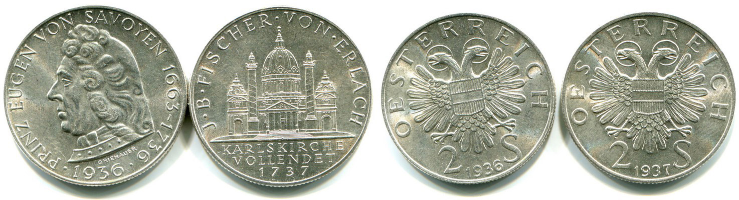 2 šilink 1936 Evžen Savojský, 2 šilink 1937 Fischer von Erlach, 2 ks