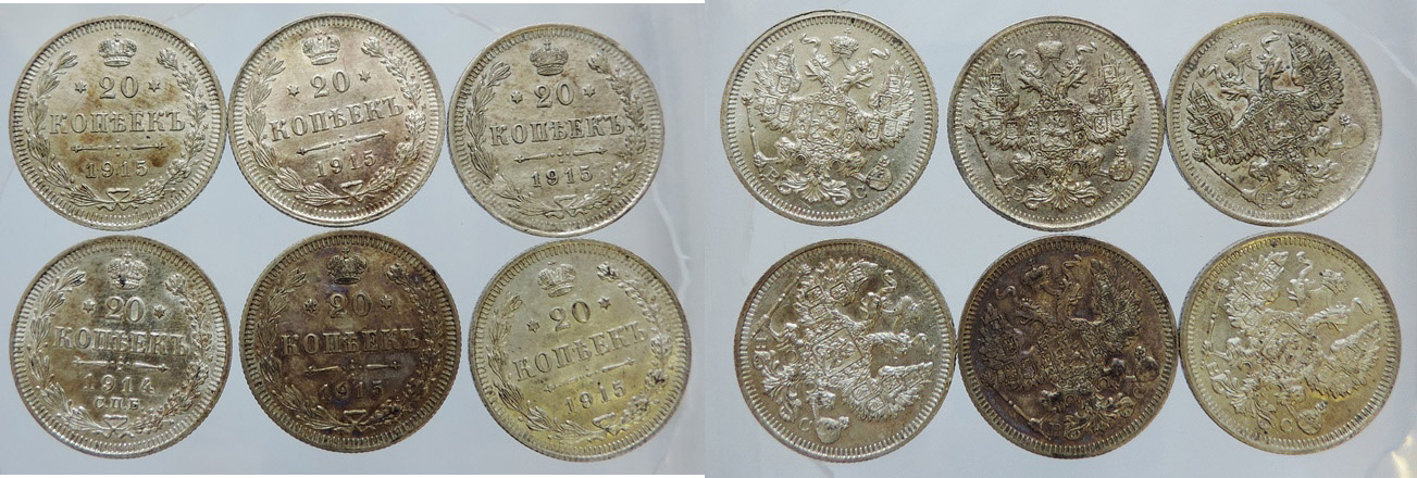 20 kopejek 1914 SPB, 1915 BC - 5x, z toho 2x 1/1 jinak celkem 6ks