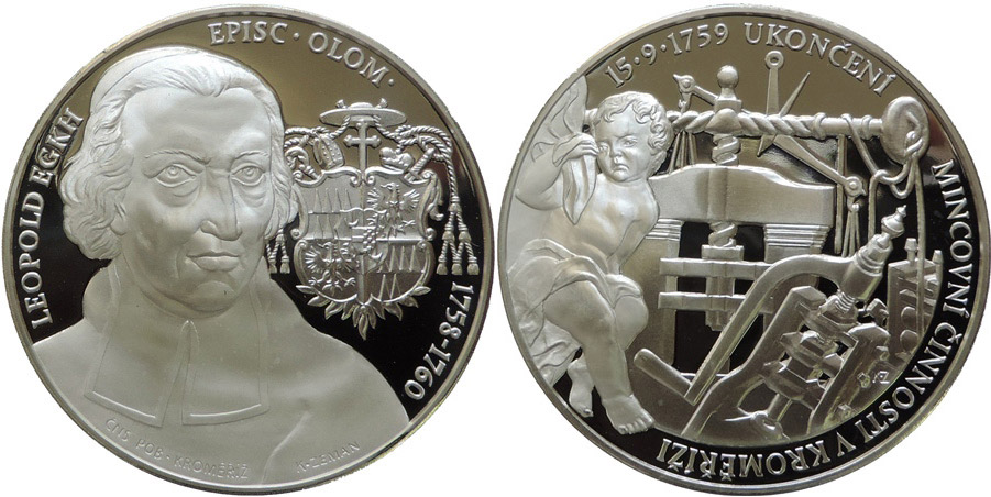 Zeman Karel, AR medaile 2020, biskup Leopold Egkh, ukončení mincovní činnosti v Kroměříži 1759, vydala ČNS pobočka Kroměříž, Ag 999, 50mm/ 50g etue, certifikát