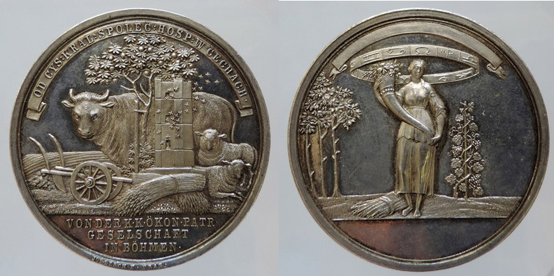 Lerch J., AR medaile, Císařsko-královská hospodářská společnost v Čechách, av: dobytek a zemědělské atributy, opis ve stuze a dole 3řádkový nápis/ stojící žena s rohem hojnosti, snopy, ovocné stormy a vinná réva, 43,5mm/43,362g