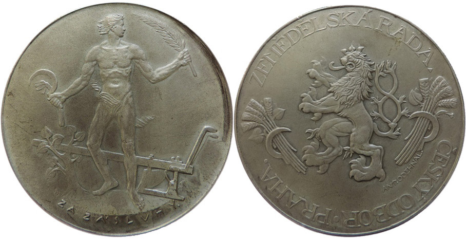 Odehnal A., ČSR 1918-1939, AR medaile "Za Zásluhy" 55mm/75,393g, Zemědělská rada - český odbor Praha, zemědělec se srpem a ratolestí/český lev, po stranách snopy, Ag 987 punc na hraně