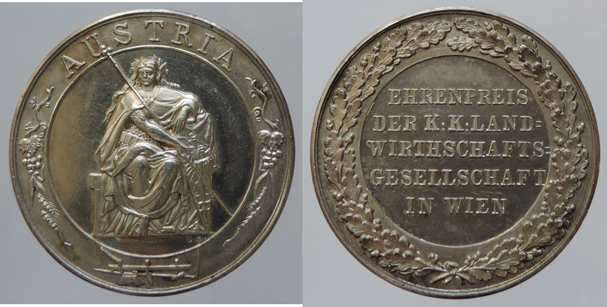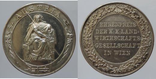 FJI, AR záslužná medaile K.K. Landwirstchafts Gesellschaft in Wien, 37mm/25,795g, sedící Austria, v opise zemědělské atributy/ 5řádkový nápis ve věnci, sign. CR