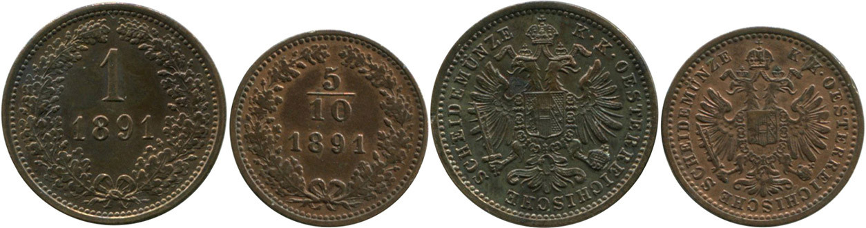 1 krejcar 1891 b.z., 5/10 krejcaru 1891 b.z., 2 ks