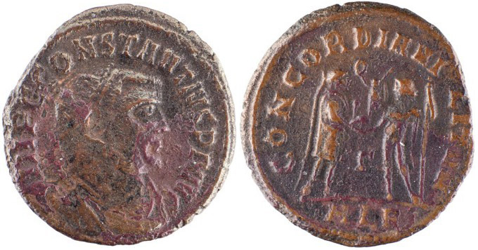 AE radiatus, rv: císař a Jupiter si předávají Viktorii, RIC 59a, Alexandria