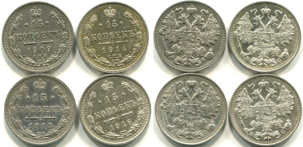 15 kopějka 1909, 1914, 1915, 1916, 4ks