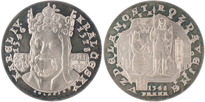 Kolářský Z. (1978), Karel IV. 1346-1378 poprsí císaře/panovník klečící před sv.Václavem, v pozadí univerzita, Ag 900, 24,985g/38mm, kapsle