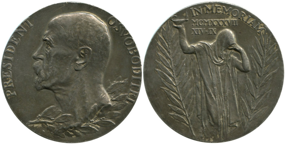 Španiel Otakar 1881-1955, medaile T.G.M. 1937 úmrtní, sign, Ag 55.48g 50 mm, punc