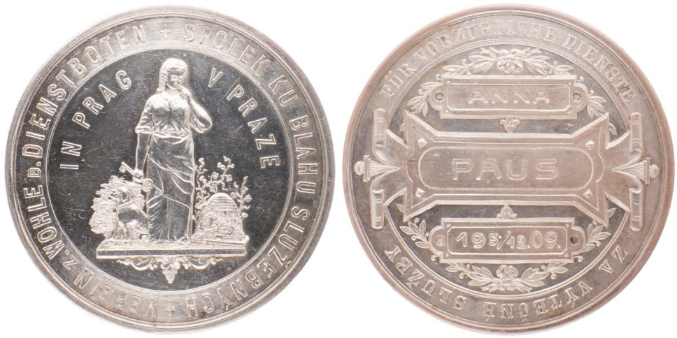 nesign., "Spolek pro blaho služebných v Praze", dvojjazyčná, av: dívka s klíčem v ruce, pes a včelí úl s ratolestmi, vyryto jméno Anna Paus, 5/12 1909, 47mm/42,539g