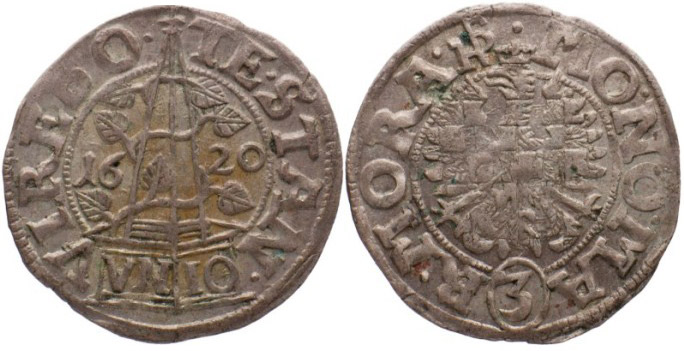 3 krejcar 1620 HP Brno-Pecz, MKČ 602, patina, krásný exemplář