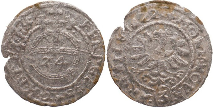 3 krejcar = 1/24 tol. 1622, MKČ 633var., Ejzenhart-Miller 591, opis na rubu MONE.NOVA(3)ARG.SILE.1622, napr.okr. RR