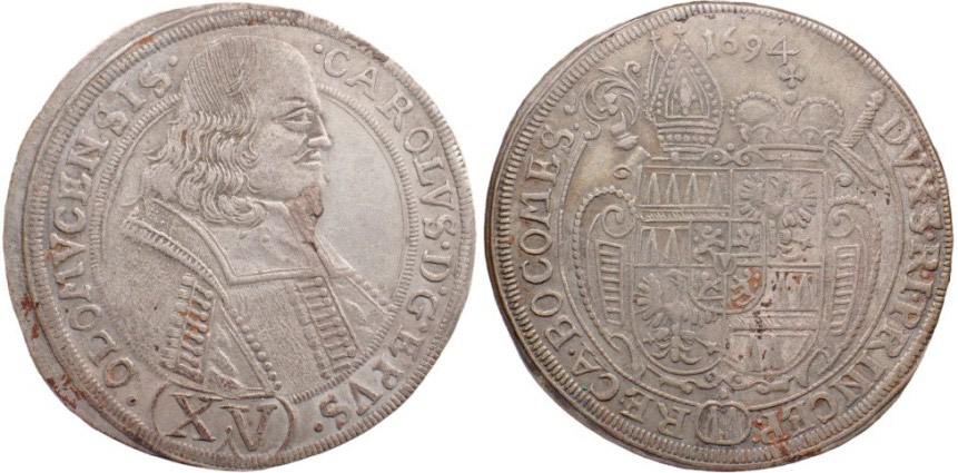 XV krejcar 1694, SV-389, za hlavou tečka, dr.kor.nálitek, pěkná patina
