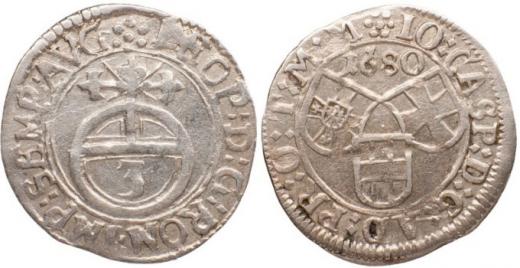 3 krejcar 1680 Mohuč, Dudík 261, Repert. 14/17, Neumann 143