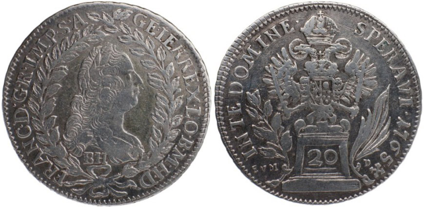 20 krejcar 1765 BH/Evm-D pro Olavu, posmrtná ražba 1773, Nov.34
