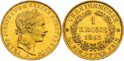 Spolková koruna 1863, Viedeň, 11,11 g, 24 mm, Au, R! Vzácný!, Frühwald 1285, Herinek 212, Friedberg 496, Novotný 120,