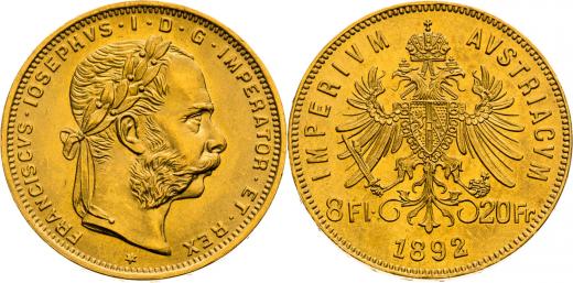 8 Zlatník 1892 (Novoražba), Viedeň, 6,45 g, 21 mm, Au, Frühwald 1326, Herinek 251, Friedberg 502R, Novotný 126,