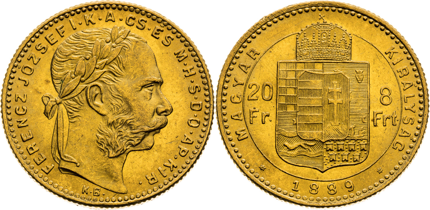 8 Zlatník 1889, Kremnica, 6,45 g, 21 mm, Au, Frühwald 1737, Herinek 273, Friedberg 243, Huszár 2117, Novotný 128,