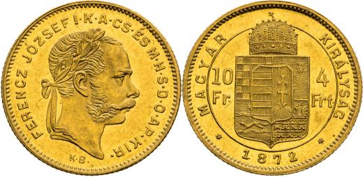 4 Zlatník 1872, Kremnica, 3,27 g, 19 mm, Au, Frühwald 1745, Herinek 294, Friedberg 246, Novotný 123,