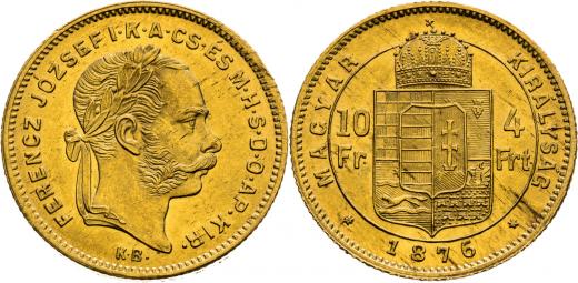 4 Zlatník 1876, Kremnica, 3,27 g, 19 mm, Au, Ex Rauch 70/2002 #2696, Frühwald 1749, Herinek 298, Friedberg 246, Novotný 123,