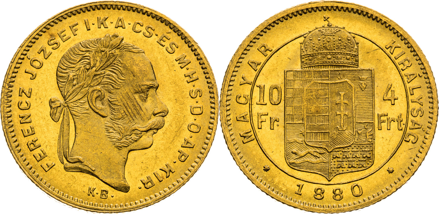 4 Zlatník 1880, Kremnica, 3,27 g, 19 mm, Au, Frühwald 1753, Friedberg 246,