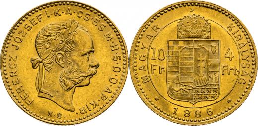 4 Zlatník 1886, Kremnica, 3,27 g, 19 mm, Au, Frühwald 1760, Herinek 309, Friedberg 247, Novotný 124,