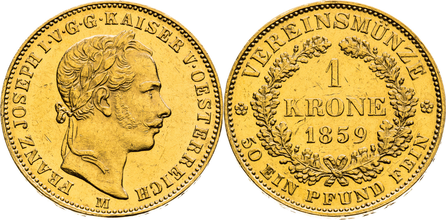 Spolková koruna 1859, Miláno, 11,11 g, 24 mm, Au, RR! Velmi vzácný!, Ex Rauch 43/1989 #2424, Ex Rauch/Monimat 1989 #1053, Ex Künker 201/2012 #104, , Frühwald 1281, Herinek 217, Friedberg 741k, Novotný 120,