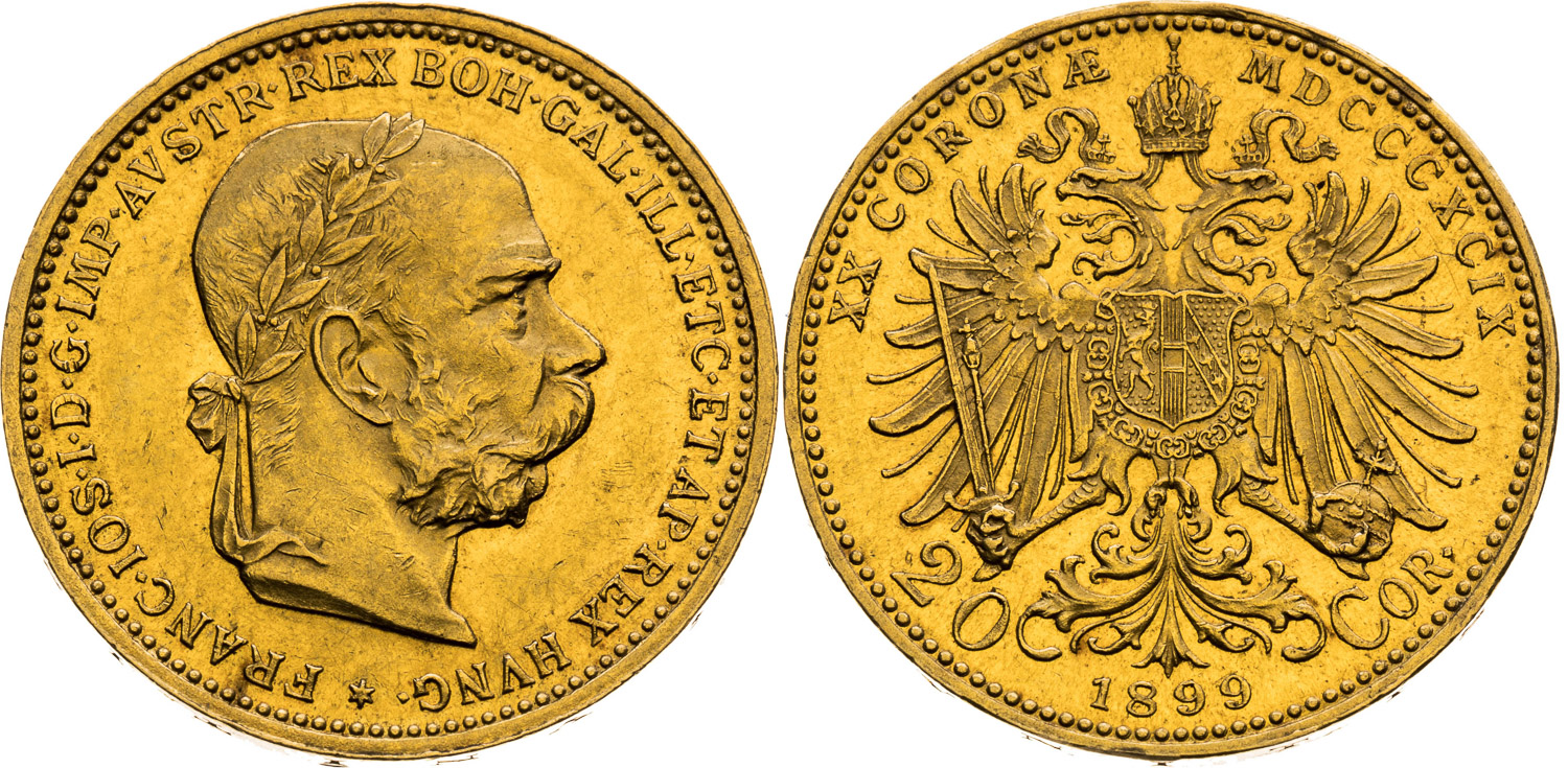20 Korona 1899, Viedeň, 6,76 g, 21 mm, Au, Frühwald 1931, Herinek 335, Novotný 134, Friedberg 504,