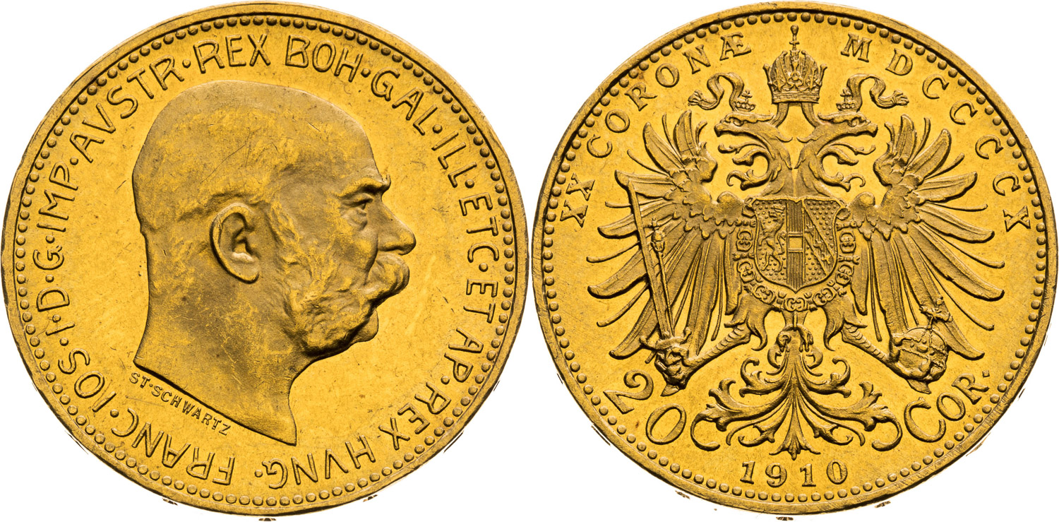 20 Korona 1910, Viedeň, S. Schwartz, 6,76 g, 21 mm, Au, Frühwald 1940, Herinek 345, Novotný 136, Friedberg 509,