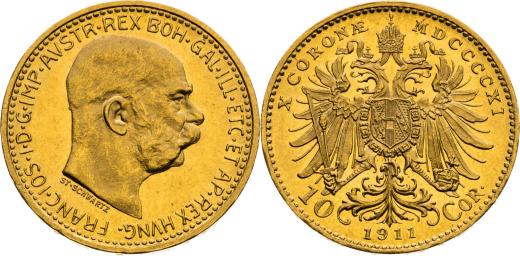 10 Korona 1911, Viedeň, S. Schwartz, 3,39 g, 19 mm, Au, Frühwald 1957, Herinek 390, Novotný 132, Friedberg 513,