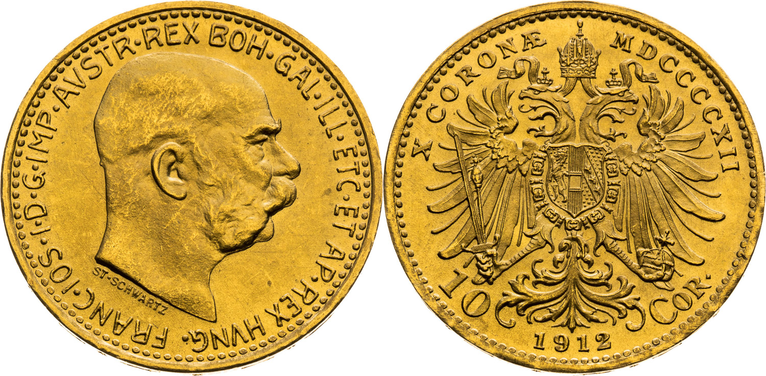 10 Korona 1912 (Novoražba), Viedeň, S. Schwartz, 3,39 g, 19 mm, Au, Frühwald 1958, Herinek 391, Novotný 132, Friedberg 513R, Moravec 121,