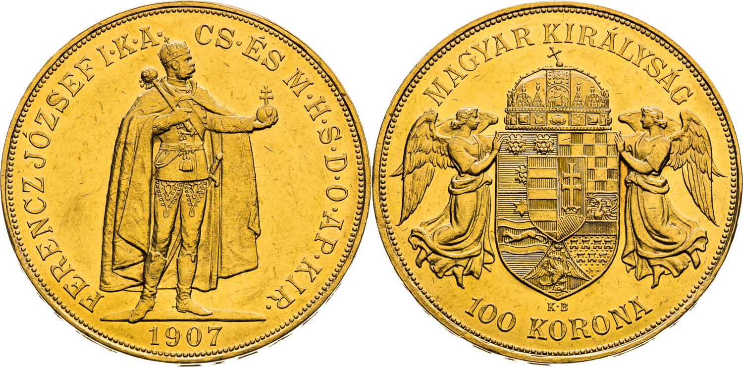 100 Korona 1907, Kremnica, 33,88 g, 37 mm, Au, R! Vzácný!, Frühwald 2054, Huszár 2197, Herinek , Novotný 141, Friedberg 249,