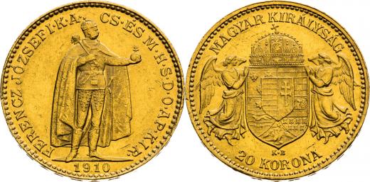 20 Korona 1910, Kremnica, 6,78 g, 21 mm, Au, Frühwald 2074, Herinek 371, Novotný 138, Friedberg 250,