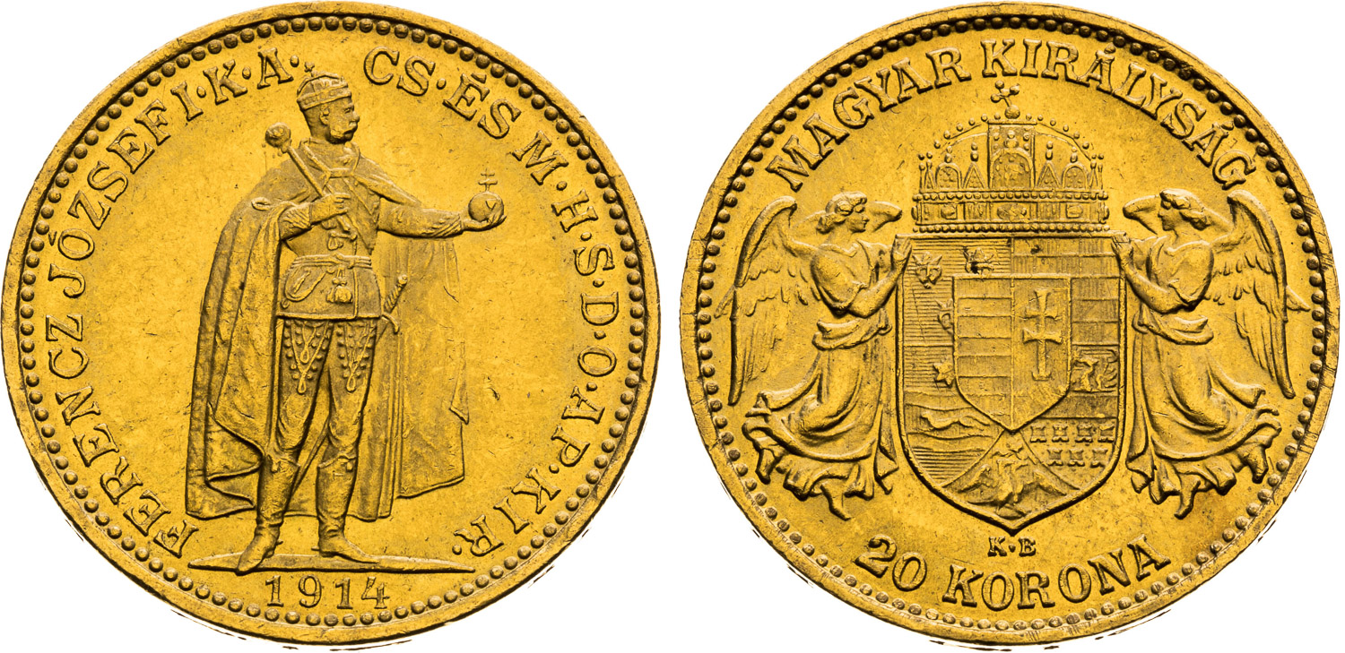 20 Korona 1914, Kremnica, 6,78 g, 21 mm, Au, Frühwald 2078, Herinek 375, Novotný 138, Friedberg 250,