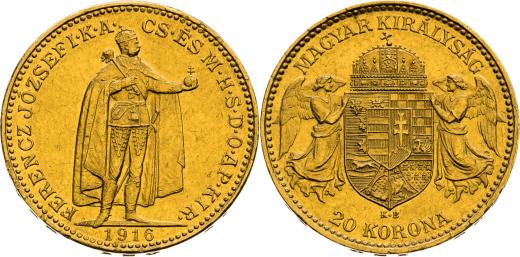 20 Korona 1916, Kremnica, 6,78 g, 21 mm, Au, Frühwald 2081, Herinek 379, Novotný 139, Friedberg 251,
