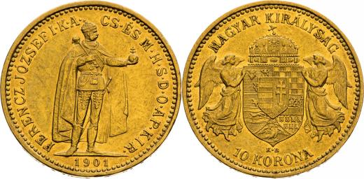 10 Korona 1901, Kremnica, 3,387 g, 19 mm, Au, Frühwald 2091, Herinek 401, Novotný 133, Friedberg 252,