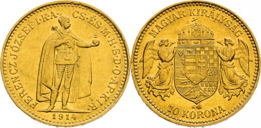 10 Korona 1914, Kremnica, 3,387 g, 19 mm, Au, Frühwald 2104, Herinek 414, Novotný 133, Friedberg 252,