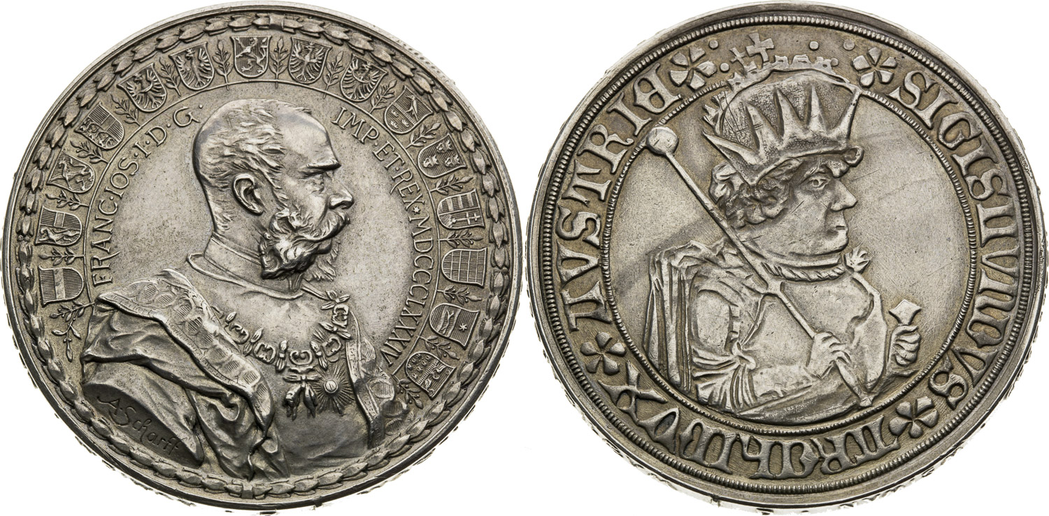 Stříbrná medaile 1884 (Tolar), 400. výročí první tolarové měny v Rakousku, Viedeň, A. Scharff, 28,03 g, 36,4 mm, Ag, RR! Velmi vzácný!, Herinek 829, Valovič 152, Moravec 199, Novotný 152,