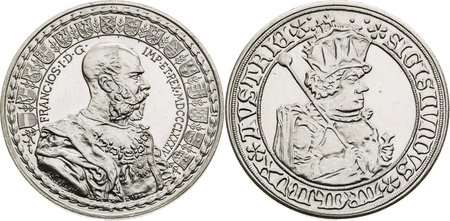 Stříbrná medaile 1884/1974 (Novoražba), 400. výročí první tolarové měny v Rakousku, Viedeň, A. Scharff, A. Peter, 21,63 g, 36,5 mm, Ag, Valovič FJ 152 V.2,