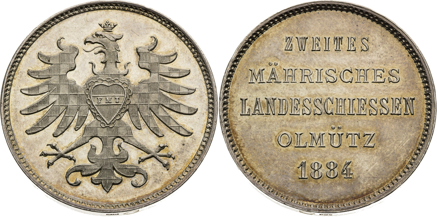 Stříbrná medaile 1884 (2 Zlatník), II. moravská střelecká soutěž v Olomouci, Viedeň, J. Christlbauer, 18,3 g, 32,8 mm, Ag, Austria (2018) XXX., Hauser 5126, Horsky 6688, Wurzbach 6958,