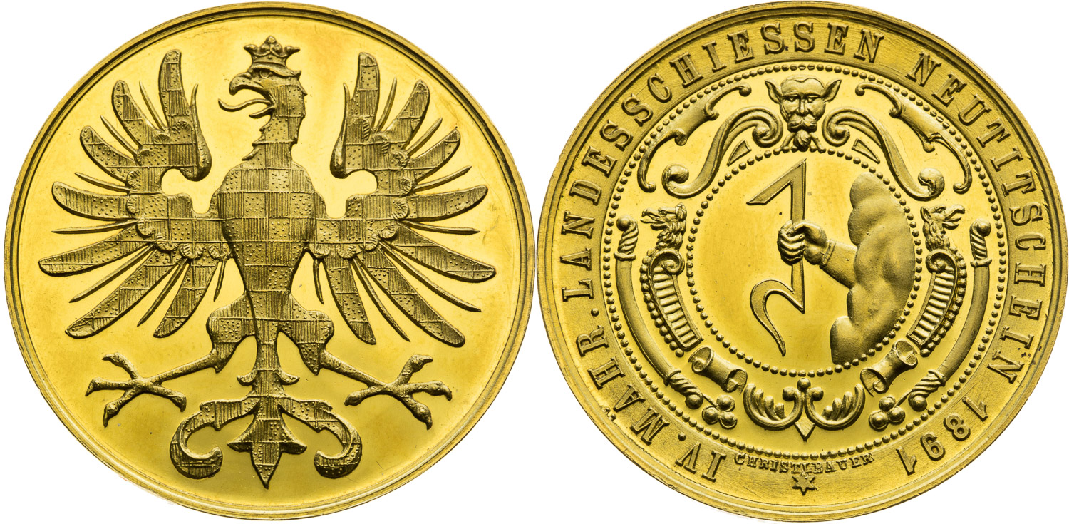 Zlatá medaile 1891 (4 Dukát), IV. moravská střelecká soutěž v Novém Jičíně, Viedeň, J. Christelbauer, 13,6 g, 36,3 mm, Au, RRR! Extrémně vzácný!, Hauser 5165, Unger 2852, Horsky 6649, Wurzbach 6742,