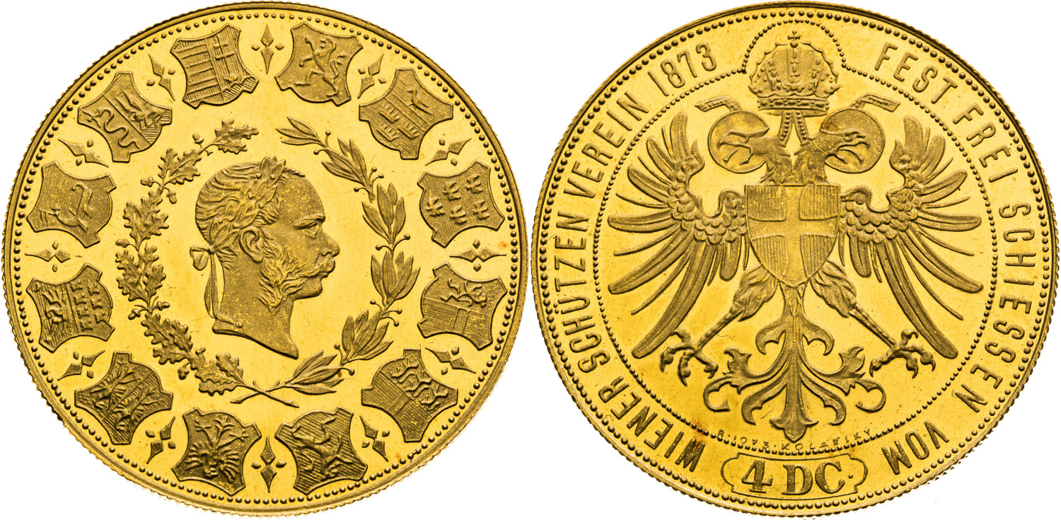 Zlatá medaile 1873/1973 (4 Dukát), Střelecké závody ve Vídni při příležitosti 25. výročí vlády Františka Josefa I., Viedeň, Z. Kolářský, 18 g, 36,1 mm, Au, R! Vzácný!, Valovič FJ 144 V.1, Moravec (FJ) 175 a,